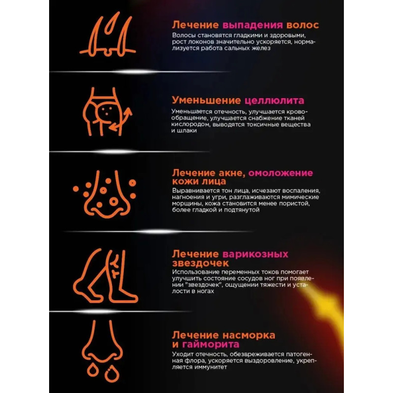 Технология дарсонвализации основана на использовании высокочастотного тока, который подается через специальные стеклянные электроды. При этом происходит микромассаж тканей и улучшение микроциркуляции, что ведет к: