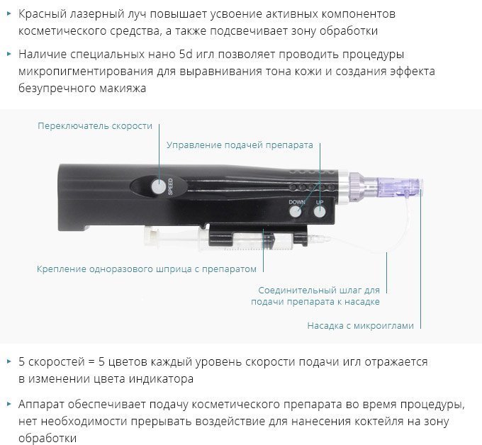 Особенности модели Аппарат для фракционной мезотерапии с подачей раствора Dermapen модель P19